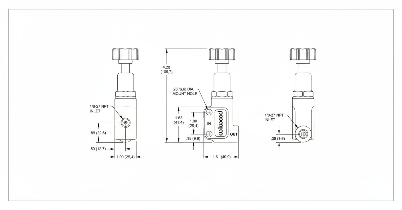 Pressure is precisely managed via an adjuster knob featuring fine-thread tuning, allowing the user to make minute, repeatable changes to the pressure curve. It features two .25” side mounting holes spaced 1.00” apart for installation. The unit is designed with 1/8-27 NPT inlet and outlet ports and is supplied with two 1/8-27 NPT to 3/8-24 inverted flare female fittings, enabling straightforward compatibility with most domestic 3/16” hard brake lines.